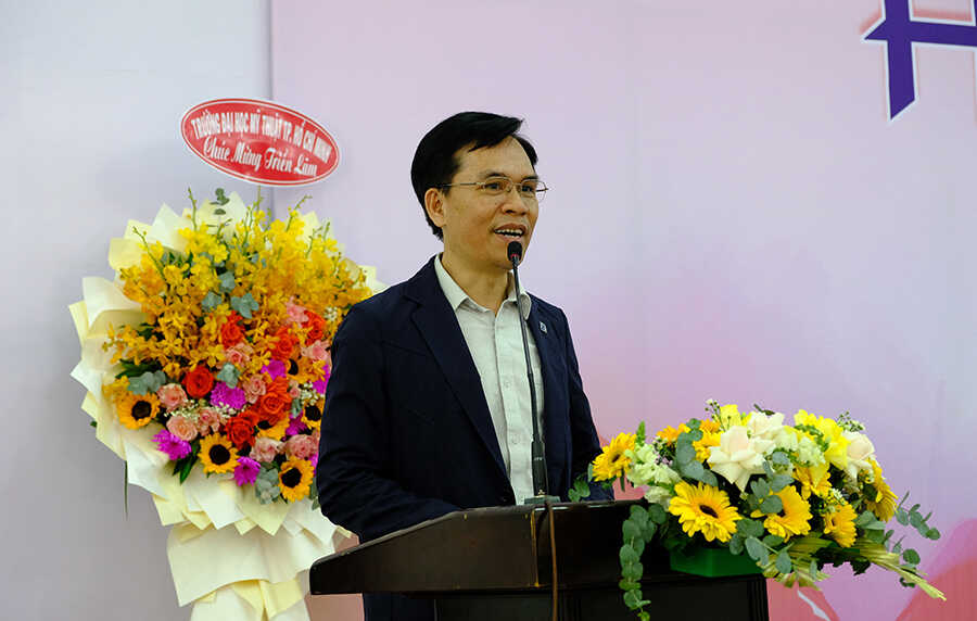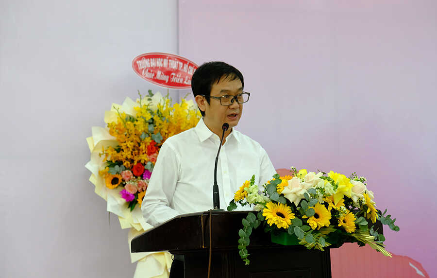 Phát biểu khai mạc triển lãm, Thầy Bùi Hải Châu - Chủ tịch Công đoàn Nhà trường cho biết đây là hoạt động góp phần thúc đẩy phong trào sáng tạo nghệ thuật và tăng cường sự gắn kết trong toàn trường. Triển lãm “Hương sắc tháng 3” không chỉ là điểm nhấn trong chuỗi hoạt động tháng 3 mà còn hướng tới việc trở thành hoạt động thường niên, góp phần xây dựng môi trường giao lưu nghệ thuật, nuôi dưỡng cảm hứng sáng tạo và khẳng định vai trò của Nhà trường trong đào tạo mỹ thuật. Thầy Bùi Hải Châu cũng gửi lời cảm ơn đến các tác giả đã nhiệt tình tham gia, đóng góp nhiều tác phẩm chất lượng, đồng thời trân trọng ghi nhận sự đồng hành của các đơn vị tài trợ, đặc biệt là Công ty Cổ phần Đầu tư và Phát triển Giáo dục Lumina Academy.