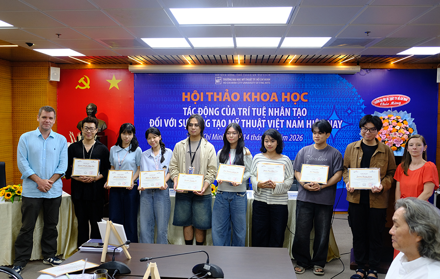 Hội thảo cũng là dịp tổng kết workshop “Sáng tạo nghệ thuật và trí tuệ nhân tạo - Giao điểm các góc nhìn”, do Trường Đại học Mỹ thuật TP. Hồ Chí Minh phối hợp cùng Học viện Mỹ thuật Tournai (Vương quốc Bỉ) tổ chức từ ngày 02/03/2026 đến ngày 13/03/2026. Workshop đã tạo cơ hội cho giảng viên, nghệ sĩ và sinh viên tiếp cận những trao đổi chuyên môn và thực hành liên quan đến sự giao thoa giữa sáng tạo nghệ thuật và trí tuệ nhân tạo. Kết thúc chương trình, Ban Tổ chức đã trao Giấy chứng nhận tri ân đến các Giáo sư, giảng viên đã tham gia giảng dạy và chia sẻ chuyên môn tại workshop, đồng thời trao Giấy chứng nhận hoàn thành cho các học viên, sinh viên tham gia chương trình workshop.