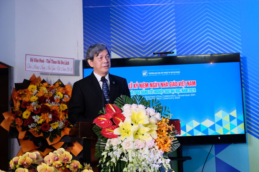Phát biểu chào mừng tại buổi lễ, PGS.TS. Nguyễn Văn Minh - Bí thư Đảng ủy, Hiệu trưởng gửi lời tri ân đến toàn thể quý thầy cô giáo đã và đang tham gia đào tạo tại Trường và mong quý thầy cô tiếp tục đồng hành cùng Nhà trường trong sự nghiệp cao cả. PGS.TS Nguyễn Văn Minh cho rằng Nhà trường có được những thành tựu trong suốt 111 năm qua là do công lao không chỉ là đội ngũ thầy giáo, cô giáo mà còn là những viên chức Phòng ban, Trung tâm, những người lao động phục vụ cho nhiệm vụ đào tạo cũng có vai trò hết sức to lớn. Vinh dự và tự hào với truyền thống và lịch sử Nhà trường, chúng ta càng ý thức về trách nhiệm lớn lao mà Đảng, Nhà nước và nhân dân giao phó. PGS.TS Nguyễn Văn Minh cho biết Nhà trường đã và đang không ngừng phấn đấu, từng bước cải tiến, đầu tư, phát triển về các ngành đào tạo, quy mô về cơ sở vật chất phục vụ đào tạo và luôn hoàn thành sứ mệnh là trung tâm đào tạo tài năng mỹ thuật của phía Nam và cả nước. PGS.TS. Nguyễn Văn Minh gửi gắm đến các học viên và NCS niềm tin và trách nhiệm, sẽ phát huy tốt nhất các tố chất và năng lực chuyên môn của mình, đứng vững trên nền tảng của nghiên cứu khoa học và bản lĩnh nghệ sĩ để trở thành chuyên gia trong lĩnh vực mình nghiên cứu, đóng góp cho đời sống mỹ thuật thêm đa dạng, góp phần nâng cao trình độ thẩm mỹ cho công chúng.