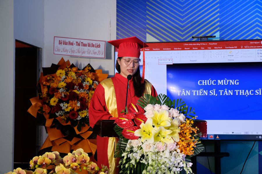 Đại diện học viên và nghiên cứu sinh, NCS Hồ Thị Thanh Nhàn gửi lời tri ân tới tất cả quý thầy cô vì trách nhiệm, những đổi mới sáng tạo, sự tâm huyết của quý thầy cô cùng nhiệm vụ lớn lao trong sự nghiệp đào tạo, đã dìu dắt các học viên và NCS có được thành quả như hôm nay.