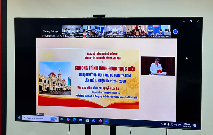 Sáng ngày 25/09/2025, Thực hiện chỉ đạo của Đảng ủy UBND TP. Hồ Chí Minh, Đảng ủy trường Đại học Mỹ thuật TP.HCM tổ chức cho Đảng viên, Ban Chấp hành Công đoàn và Đoàn thanh niên Nhà trường tham dự Hội nghị học tập, quán triệt Nghị quyết và Chương trình hành động thực hiện Nghị quyết Đại hội đại biểu Đảng bộ Ủy ban Nhân dân Thành phố lần thứ I, nhiệm kỳ 2025 - 2030 bằng hình thức trực tuyến tại Phòng họp lầu 3 Nhà học Lý thuyết.