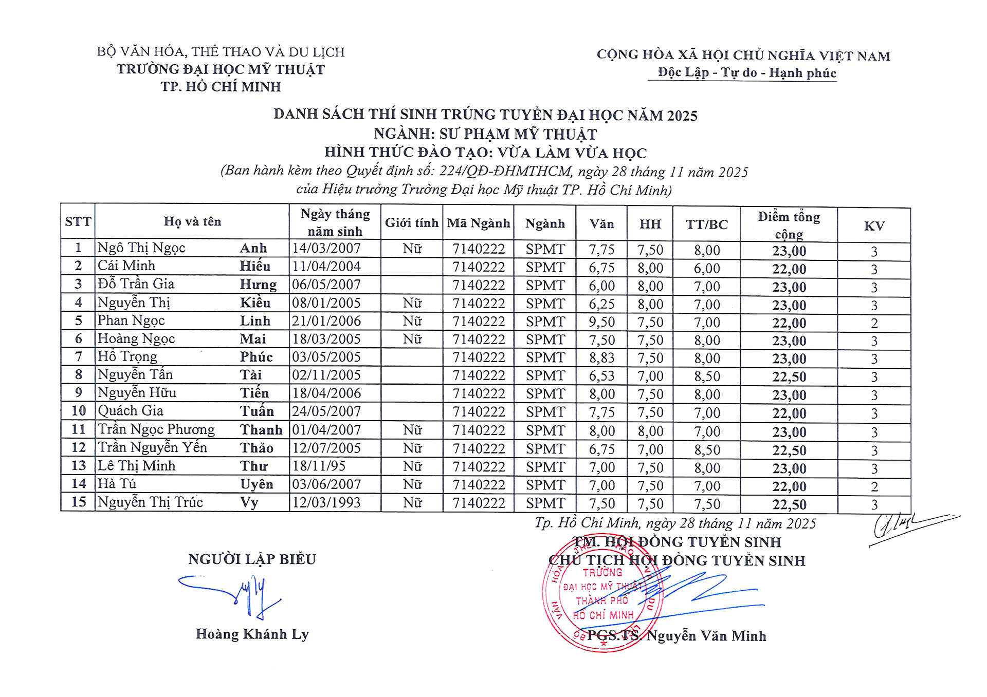 DANH SÁCH THÍ SINH TRÚNG TUYỂN ĐẠI HỌC NĂM 2025 - NGÀNH SƯ PHẠM MỸ THUẬT- HÌNH THỨC ĐÀO TẠO VLVH