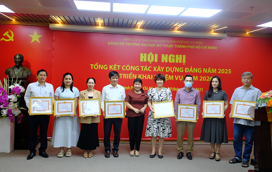 Nhân dịp này, Đảng ủy trường Đại học Mỹ thuật TP.HCM đã khen thưởng Chi bộ Phòng Ban 2 đạt “Trong sạch vững mạnh tiêu biểu”; 03 Chi bộ hoàn thành xuất sắc công tác năm 2025; 06 đảng viên Hoàn thành xuất sắc nhiệm vụ năm 2025 và 10 đảng viên Hoàn thành xuất sắc nhiệm vụ công tác Đảng bộ, Chi bộ năm 2025.