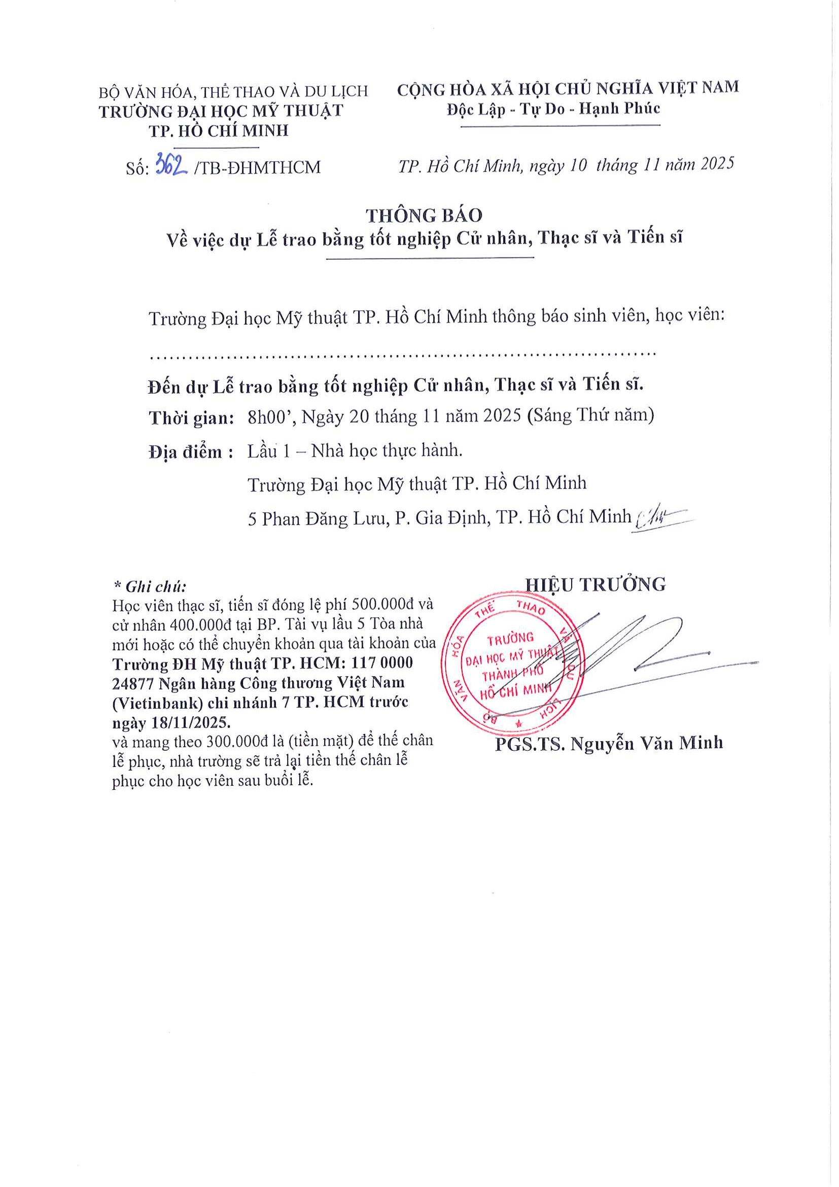 Thực hiện kế hoạch năm học 2025-2026, Nhà trường thông báo kế hoạch tổ chức Lễ Hiến chương Nhà giáo Việt Nam 20/11/2025 và trao bằng tốt nghiệp Cử nhân, Thạc sĩ và Tiến sĩ, cụ thể như sau: