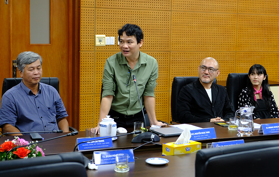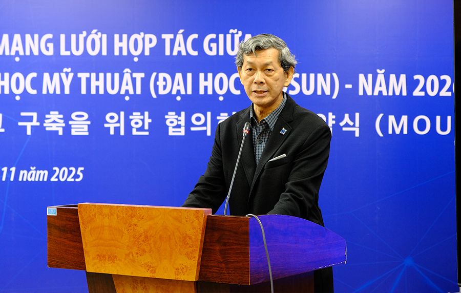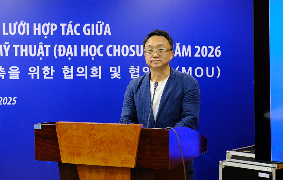 Phát biểu khai mạc hội nghị, PGS.TS Nguyễn Văn Minh gửi lời cảm ơn tới ĐH Chosun đã phát động sự kiện triển lãm chung, hướng đến kỷ niệm 80 năm thành lập Trường vào tháng 12 này. Thầy Nguyễn Văn Minh cho biết đây là sự kiện không chỉ mang tính giao lưu, trao đổi văn hóa cũng như sáng tạo trong nghệ thuật đương đại, mà còn góp phần thúc đẩy các chương trình hợp tác quốc tế, nghiên cứu đại học, sau đại học và workshop song phương trong thời gian tới đối với hai trường. Những trao đổi về chuyên môn, trao đổi sinh viên, học viên, bài giảng học thuật và sâu xa hơn là hỗ trợ trong nghiên cứu thị trường, môi trường thực tập sẽ có được cơ sở đề cập cũng như xúc tiến trong năm 2026. Hy vọng buổi giao lưu sẽ đưa ra nhiều thông tin bổ ích và thiết thực với các bạn sinh viên, học viên đang theo học các nhóm ngành mang tiềm năng phát triển trên con đường du học tại Đại Hàn Dân Quốc. Đây cũng là bước ngoặc để giúp chúng ta có cơ sở tiến đến các hoạt động giao lưu sâu sắc hơn trong thời gian tới giữa trường Đại học Mỹ thuật TP.HCM và ĐH Chosun - Hàn Quốc.
