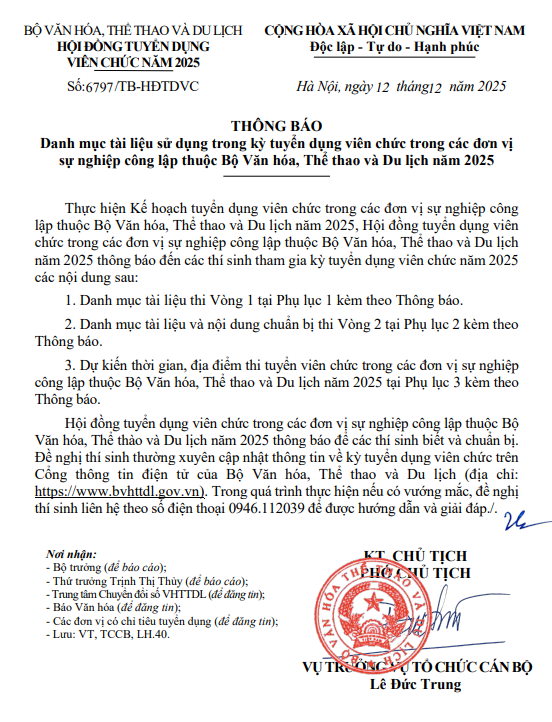 Thông báo Danh mục tài liệu sử dụng trong kỳ tuyển dụng viên chức trong các đơn vị sự nghiệp công lập thuộc Bộ Văn hóa, Thể thao và Du lịch năm 2025