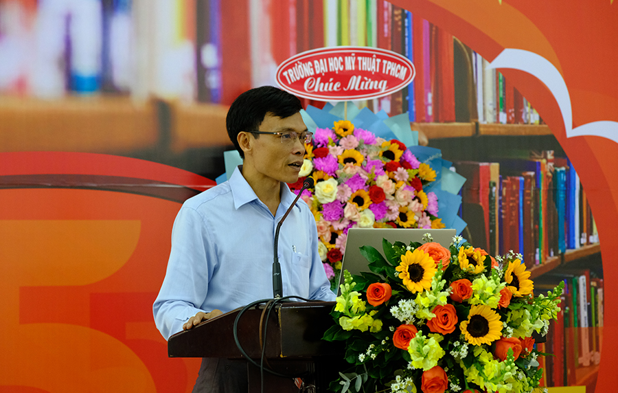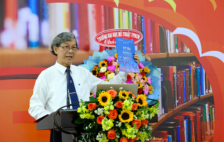 Bên cạnh đó, PGS.TS. Nguyễn Văn Minh – Hiệu trưởng Nhà trường đã giới thiệu các ấn phẩm mới phục vụ công tác giảng dạy và nghiên cứu, gồm: Vựng tập Ký họa thực tế và tác phẩm Tốt nghiệp của sinh viên Trường Đại học Mỹ thuật TP. Hồ Chí Minh; Kỷ yếu 30 năm đào tạo trình độ thạc sĩ (1995 - 2025) và 10 năm đào tạo trình độ Tiến sĩ (2015 - 2025); cùng ấn phẩm Triển lãm nghệ thuật Sơn mài Sài Gòn lần thứ 4 - năm 2026.
